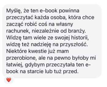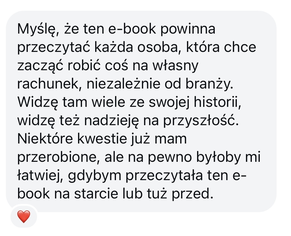 „Nie traktujcie, proszę, tego e-booka jako poradnika, bo nie jestem specjalistką. Nie dowiecie się z niego, jak krok po kroku otworzyć firmę. Dowiecie się jednak, jakie zakręty i przyczajone przeszkody czekają na tej drodze i nie zawsze lubią odsłaniać się w odpowiedniej chwili, a co za tym idzie, nie zawsze można się na nie przygotować.