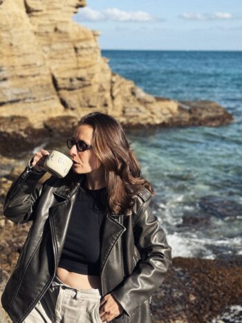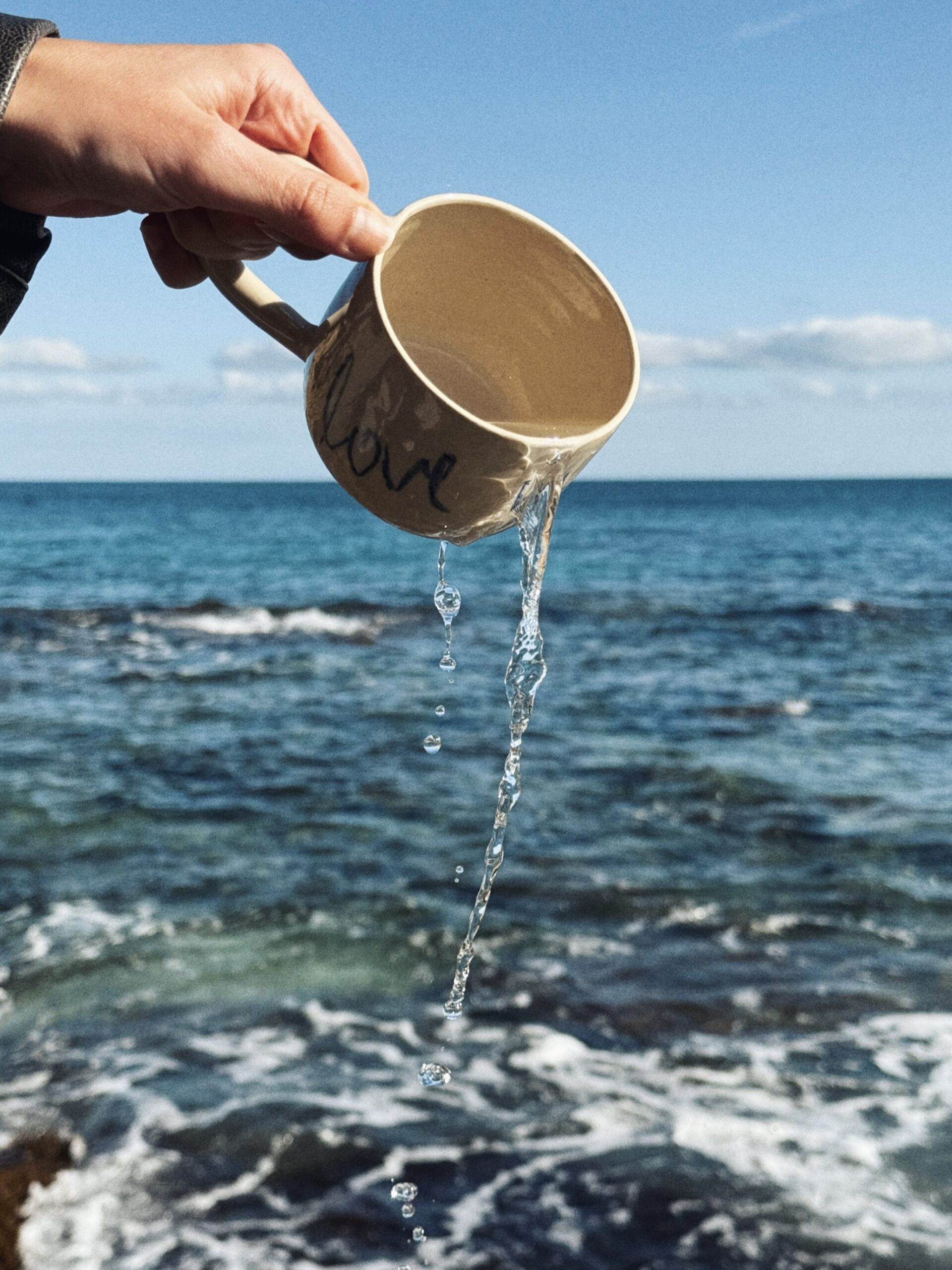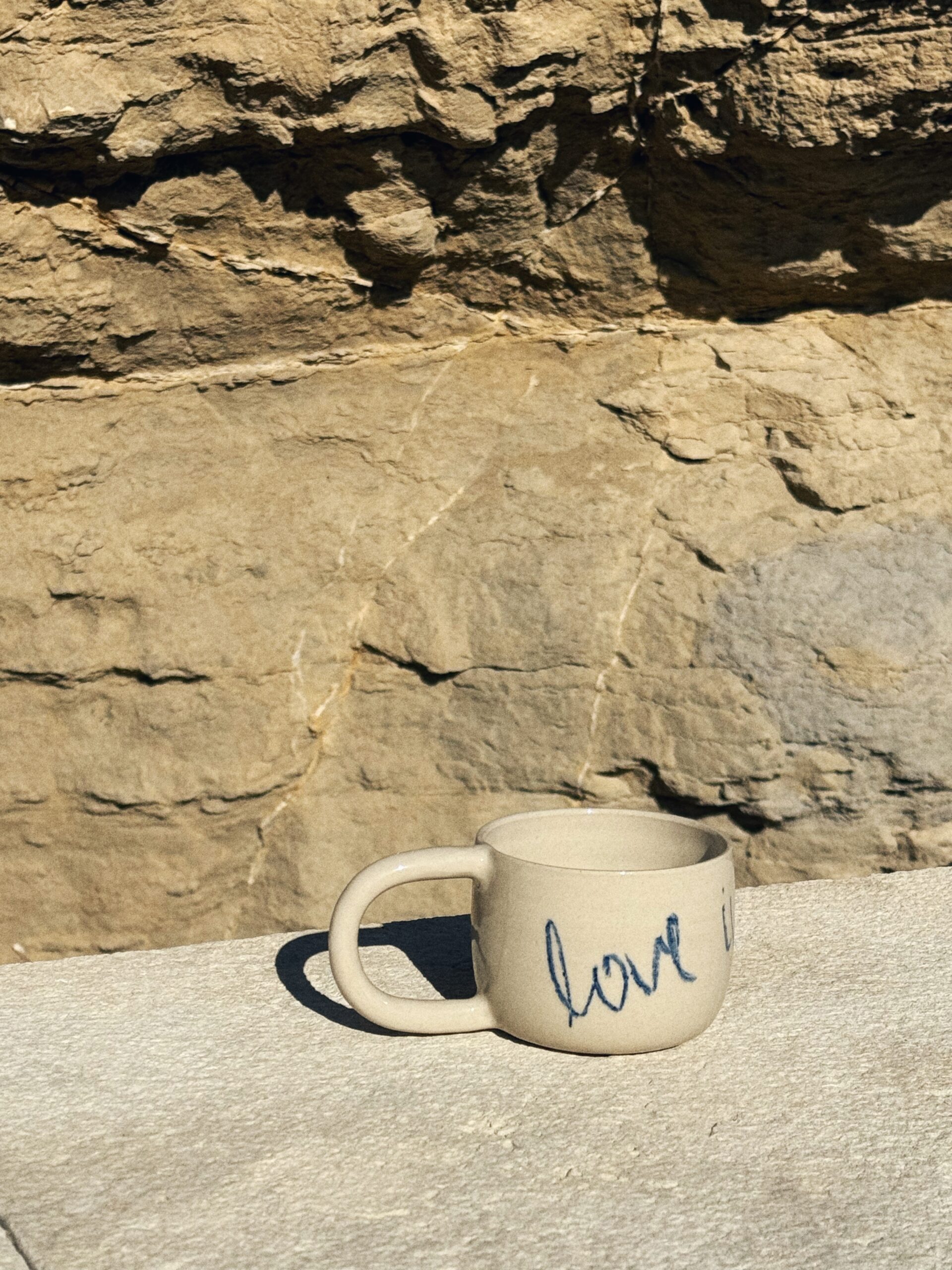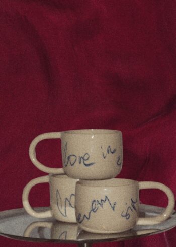Kubek ceramiczny LOVE IN EVERY SIP. Każdy egzemplarz stworzony został ręcznie, a napis wykonany na naczyniu przywodzi na myśl ciepło i troskę. Idealny prezent dla tych, którzy doceniają małe momenty i codzienne rytuały.