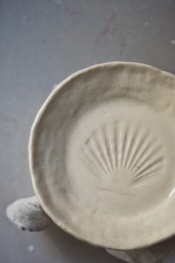 Patera ceramiczna wykonana ręcznie w naszej niewielkiej pracowni w Warszawie. Do jej wykonania użyłam szamotowej, hiszpańskiej gliny w ciepłym odcieniu. Na środku naczynia odciśnięta została prawdziwa muszla morska.
