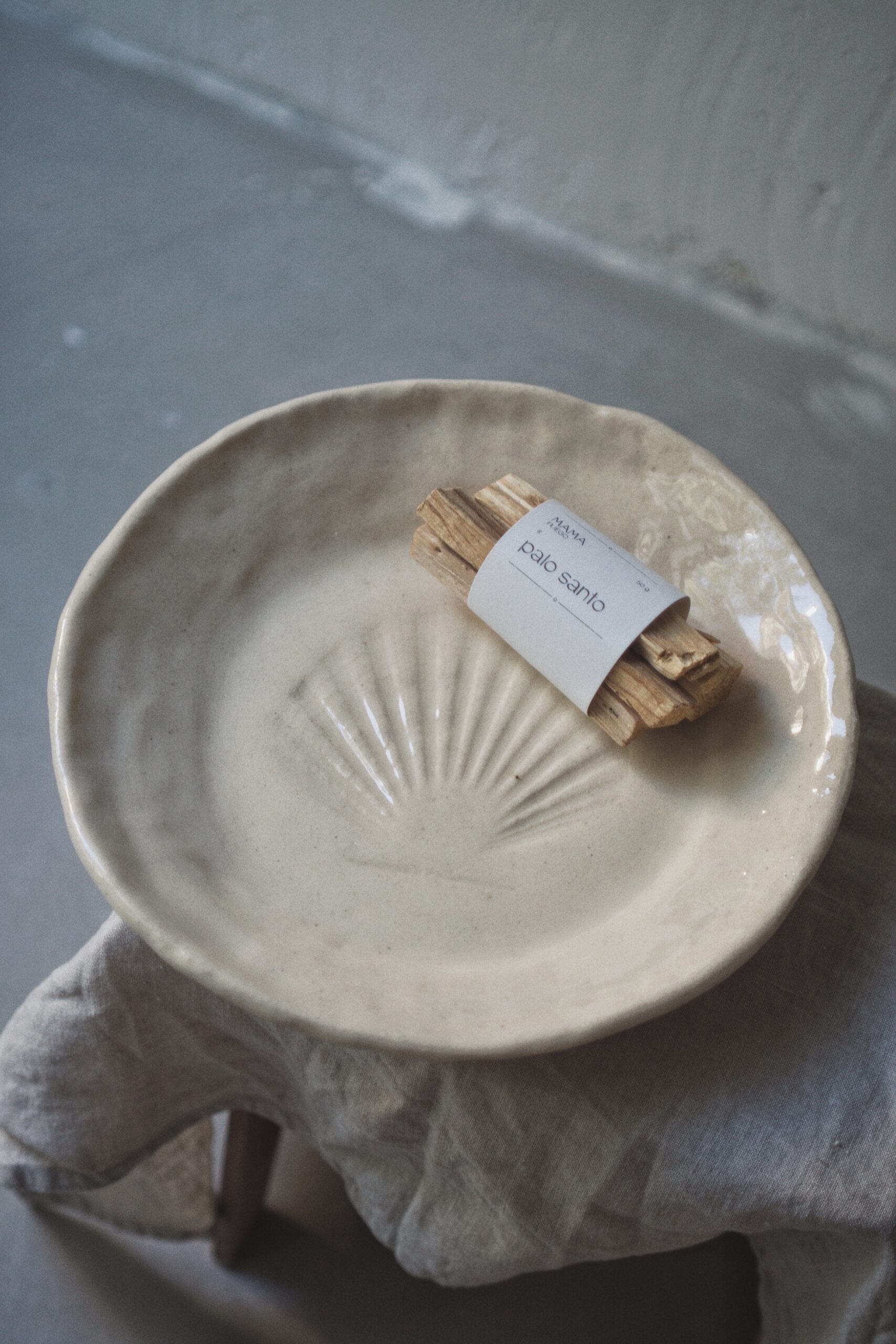 Podkładki ceramiczne pakujemy nieco inaczej. Pierwszą warstwą chroniącą ceramikę przed stłuczeniem jest szary papier z recyklingu. Owijamy nim dokładnie naczynia, a później umieszczamy je w lnianym woreczku sygnowanym logo Mama Fuego. Len jest naturalnym materiałem ulegającym biodegradacji, co czyni go przyjaznym środowisku.